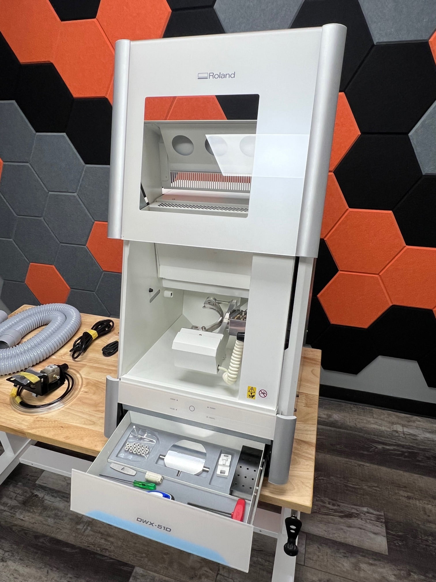 Included Items | Power cord, USB cable, Regulator, Air hose, Pin-type material adapter, Automatic correction jig, Detection pin, Torque screwdriver, Milling bur holders, Mounting screws, Hexagonal screwdriver, T-shaped hexagonal screwdriver, Dust collection hoses, Dust collection hose adapter, spanner, Roland Software Package CD, Torque screwdriver, Ferrite core, Manuals |